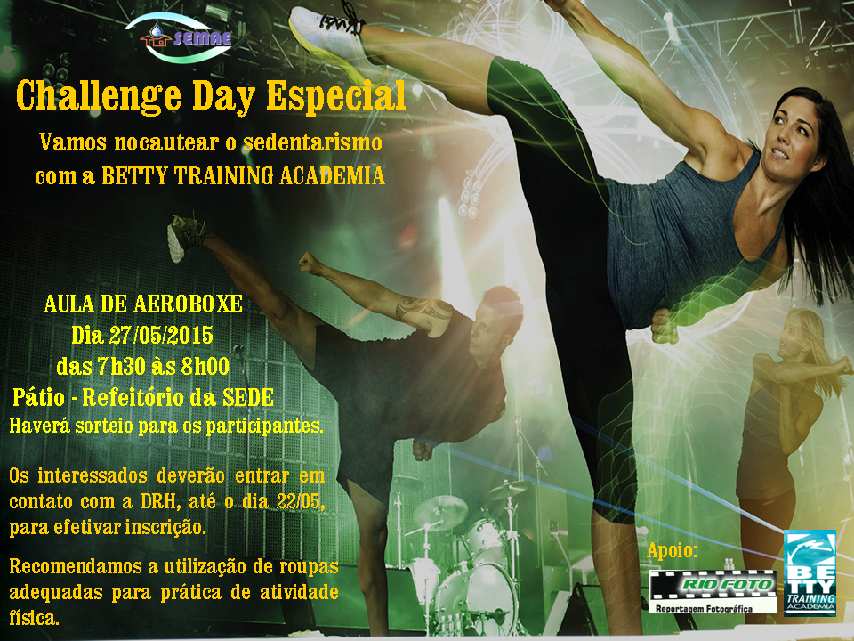 O Semae - Serviço Municipal de Água e Esgoto de Piracicaba participará do próximo Dia do Desafio, que este ano acontece no dia 27 de maio. Na autarquia, o evento será das 7h30 às 8h, e os servidores participarão de uma aula de Aeroboxe com a Betty Training Academia, além de degustação de suplementos nutricionais da Herbalife e sorteios de brindes.